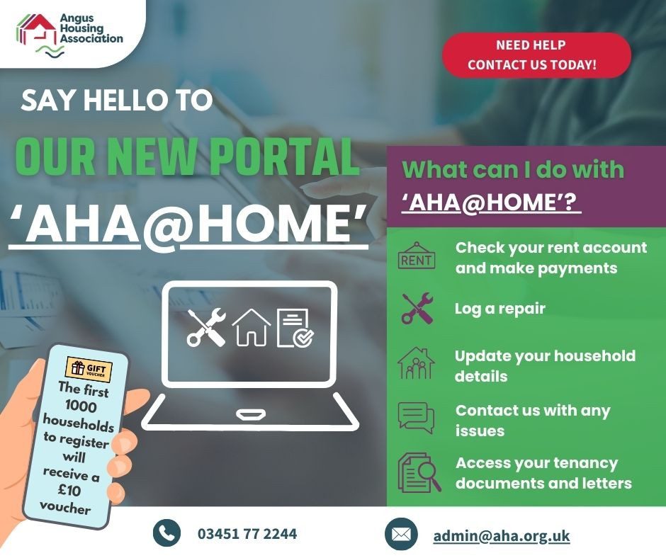 👉 https://angus.myhome-portal.com, then click on ‘register’, or ‘log In’, if you have already signed-up to our previous portal. Then you will be given further instructions to follow. You can also access ‘AHA@HOME’ by clicking Tenant Portal link on the top bar of our Website.